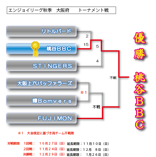 | ○ | 桃谷BBC | 不戦勝 | ― | 不戦負 | FUJIMON | × |