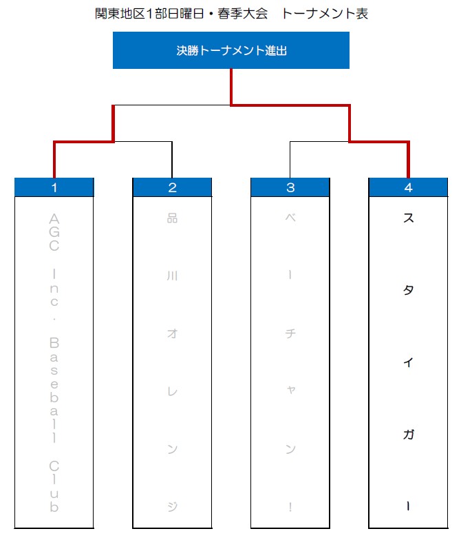AGCは2回に一気に3点先取する。オレンジは3回と4回に1、2点返し、同点に追いつく。その後、7回3-3で終了。じゃんけん対決の結果、AGCが勝ち抜ける。(品川オレンジ)