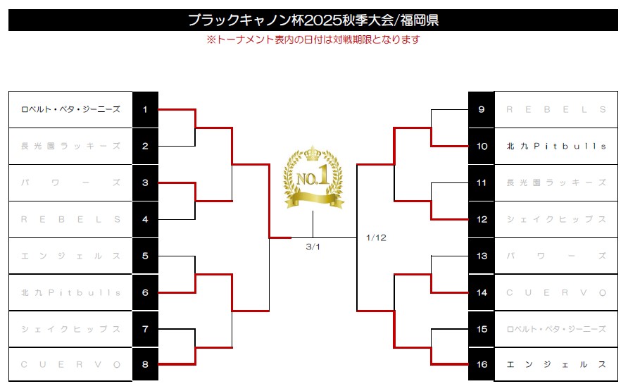 | ○ | 北九Pitbulls | 4 | ― | 0 | シェイクヒップス | × |